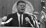 Close-up of John F. Kennedy speaking in front of microphones outside Hotel Texas.