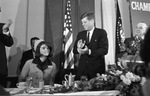 Fort Worth Chamber of Commerce breakfast, Hotel Texas, John Kennedy applauding his wife Jacqueline during introductions.