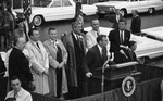 Jim Wright introducing Vice President Lyndon Johnson to crowd outside Hotel Texas, John F. Kennedy at right.