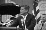John F. Kennedy speaking at microphones outside Hotel Texas to crowd.