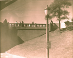 People standing on bridge overlooking grassy knoll after John F. Kennedy assassination; photo taken by photograph in moving bus carrying reporters.