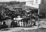 Crowd awaiting news outside Emergency Room entrance of Parkland Hospital, Dallas, following John F. Kennedy assassination; black limo under portico was the President's car.