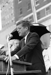 Close-up of President John F. Kennedy with eyes cast down while speaking to crowd outside Hotel Texas, 11/22/1963