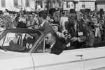 President John F. Kennedy's motorcade through Fort Worth; convertible holds reporters and photographers; Castleberry school children along street waving flags, 11/22/1963