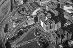 Aerial view of site of President Kennedy's assassination; Elm, Houston, and Main streets in front of Texas School Book Depository building, 11/22/1963