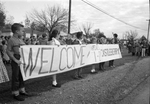Castleberry school children waiting for President John F. Kennedy's motorcade making its way to Carswell Air Force Base along River Oaks Blvd; sign says "Welcome from Grades 1 & 2 Castleberry."