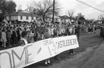 Castleberry school children waiting for President John F. Kennedy's motorcade making its way to Carswell Air Force Base along River Oaks Blvd; sign says "Welcome from Grades 1 & 2 Castleberry."