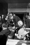 President John F. Kennedy signing autographs with Jackie Kennedy at his left and Governor John Connally on Jackie's left in the motorcade limousine outside of Hotel Texas. The motorcade drove down Main St. in downtown Fort Worth on the way to Carswell Air Force Base.