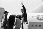 President John F. Kennedy and Jackie Kennedy enter Air Force One to fly from Carswell Air Force Base in Fort Worth to Love Field in Dallas. JFK waves to crowd at Carswell Air Force Base.