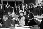 President John F. Kennedy and Jackie Kennedy with Governor John Connally in the motorcade limousine outside of Hotel Texas. The motorcade drove down Main St. in downtown Fort Worth on the way to Carswell Air Force Base. There are police officers and unidentified people standing next to the limousine.