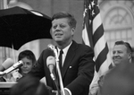 Pres. John F. Kennedy at podium in front of Hotel Texas, Fort Worth, State Senator Don Kennard over JFK's left shoulder, 11/22/1963