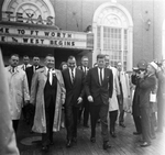 Pres. John F. Kennedy and other dignitaries stride toward podium to speak with the crowd waiting outside Hotel Texas, Fort Worth, 11/22/1963