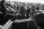 Pres. John F. Kennedy and wife Jackie approach limousine at Love Field for motorcade through Dallas; Gov. John Connally standing in car, 11/22/1963