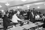 Press conference in classroom at U.T. Southwestern Medical School next to Parkland Hospital; attending physicians who tried to save Pres. Kennedy's life