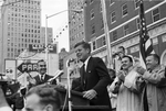 President John F. Kennedy speaking to crowd outside Hotel Texas; Star-Telegram reporter Gene Gordon on ladder behind podium taking photographs, 11/22/1963