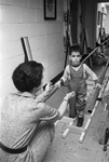 Young patient assisted by volunteer enjoys an exercise-game to exercise reluctant muscles at the Rehabilitation Center of the Fort Worth Society for Crippled Children and Adults, 4700 South Riverside Drive, 03/07/1964