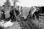 Image shows Fort Worth Policeman Henry H. Wright, second from right, bareheaded, in civilian clothes, lunges at assailant as other unidentified police officers rush to his aid after Wright was slashed across the forehead with a hoe by D. W. Miles, far right. On left a group of police officers wrestle with another man after a melee developed near Benbrook Dam. Published in Fort Worth Star-Telegram evening edition March 30, 1964.