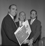 Officials of Fort Worth Cats baseball club, from left, Tommy Mercer, Dick Butler, and Lamar Hunt show baseball poster at a dinner in the Hotel Texas; Cats will make their first appearance at LaGrave Field, 04/15/1964