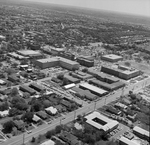The spreading Arlington State College campus, growing to meet booming enrollment, is shown here in view looking to the southeast. The huge L-shaped building in the center is the four-story 26,000 square-foot engineering building. Top right is the new library building. Not that parking space for the commuter-student school is almost one half of the actual college area. These parking lots will become the sites for future college classroom buildings. Other college buildings are out of site at the right. Published in Fort Worth Star-Telegram morning edition July 29, 1964.