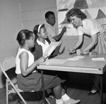 Image shows right, Mrs. Elva Biesemeier, full-time staff worker, supervises handicraft projects of Emma Jordan of 1305 Verdena, Jennifer Adams, 3209 Shaffer and Adrick Thompson of 1020 E. Stella, left to right at Bethlehem Center. Published in Fort Worth Star-Telegram morning May 3, 1964.