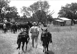 Image shows a unidentified muleskinner walking two horses to water when the Rolling Plains Mule Team Association made a mid-day stop outside Jacksboro. The mule train, with 20 wagons, stopped for the night on camp grounds at historic Fort Richardson. Published in Fort Worth Star-Telegram evening edition May 29 1964.