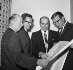 From left, Dick Butler, Lamar Hunt, Tommy Mercer, and architect Preston Geren review plans for baseball stadium to be built in Arlington, 06/30/1964