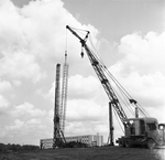 Image of a crane, part of the stepped-up construction activity on the Arlington State College campus is building of a $1,331,776 multipurpose auditorium. Workmen are setting in steel for the foundation. In the backgrounds is a three-story dormitory recently constructed. Published in Fort Worth Star-Telegram evening edition August 3, 1964.