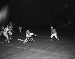 Professional football preseason exhibition game between the Kansas City Chiefs and the Denver Broncos played at Farrington Field in Fort Worth. The clipping reads "Denver Fullback Billy Joe sails earthward after being hit by Dave Grayson of Kansas City in the opening period of Friday nights' game. Joe gained seven on the play--to Kansas City's 41-yard line." Kansas City won the game, 14-10.