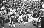 Cotton Bowl, University of Arkansas vs. University of Nebraska: University of Arkansas' Bobby Burnett (33) hurls ball after scoring deciding touchdown; Larry Wachholtz (36) of University of Nebraska heads for sidelines.