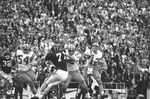 Cotton Bowl, University of Arkansas vs. Louisiana State University (L. S. U.): Louisiana State University (L. S. U.) quarterback Pat Screen throws pass; University of Arkansas tackle Jim Williams (71) is held off.