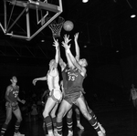 Image shows Texas Wesleyan's Don Willis, left and two Arlington State cagers, Bruce Tibbets, center and Jim Oldham (55) go for rebound in first half of basketball game between TWC and Arlington State College. Published in Fort Worth Star-Telegram morning edition January 2, 1965.