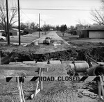 Hurstview Drive is closed by a washout from rain at its intersection with the Lorean Branch creek, Hurst, Texas. Clipping reads "The washed out area is a temporary crossing constructed by a company which is making improvements on the creek. Rains have delayed the project." The sign in the foreground reads "Road Closed."
