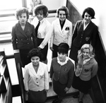 Executive officers of Arlington State College's seven social clubs don club blazers to get each group's name on campus prior to spring rush these week. Front row, left to right are Suzanne Bryan, Avolonte; Vicki Gorman, Les Choisies and Barbara Sury, Karuso Pteros. Back row, left to right, are Luellen Ifheil, Koshari; Juli Davies, Sans Souci; Linda Barr, Zongola, and Pat Reid, En Ami. Rush activities began in Arlington homes. Published in Fort Worth Star-Telegram morning edition February 16, 1965.