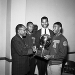 I. M. Terrell High School basketball players and coach received a round of warm congratulations at school for winning State 4A championship. Principal H. I. King, left, greets All-State Guard Ed Sanders, Coach Robert Hughes and Co-Captain Wayne Lewis. Published in Fort Worth Star-Telegram evening edition March 10, 1965.