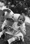 Dana Lewis, age 3 with cerebral palsy, enjoys the Easter Egg hunt ("Bunny" not identified) held for patients of the Fort Worth Crippled Children and Adults Rehabilitation Center, 4700 South Riverside Drive, 04/08/1965
