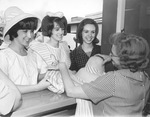 Margaret Carriher, Becky Martin, and Janice Johnson, l. to r., receive their Six Flags Over Texas uniforms from Mrs. Floyd Wine.
