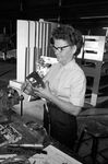 Photo feature on women who work at General Dynamics. Mrs. Ella Paul, aircraft assembler, uses a squeeze riveter on the hingle for the front door of a small missile. Since World War II women have held factory jobs once considered a man's work. More than 1,700 of the organization's 13,600 employees are women.