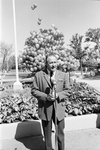 Six Flags Over Texas founder, Angus G. Wynne Jr., at opening day ceremony for 5th season, Arlington, Texas. Wynne is seen speaking into a microphone and there are several dozen balloons seen behind him.
