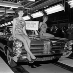 A shining 1965 Pontiac convertible topped by two female "tigers" roared down the General Motors assembly line to become the millionth automobile produced at the Arlington plant, which opened in 1954. The "tigers" are models Betty Cremer and Shirley Deis.