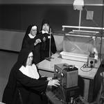 Three nuns are among the forty-eight instructors of college physics who are taking part in a three-week seminar on relativity at Arlington State College. Undertaking an experiment are Sister Mary Roswitha of the College of St. Theresa, Winona, Minnesota, left, Siter Daniel Marie of the Emmanuel College, Boston, and Sister Angela Mary of the college of Mount St. Joseph-on-the-Ohio in Ohio. Published in Fort Worth Star-Telegram July 26, 1965