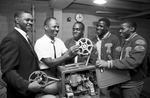 Image shows I. M. Terrell coaches, left Clyde Tillman, defense coach and Walter Day, head coach, second from left, prepare to show Houston Yates football films to key players in state finals game at Farrington Field. Quarterback Kenneth Foster, center, fullback Ernest Powell, second from right and halfback Donald Johnson, right led the Panthers to a 10-1 record . Published in Fort Worth Star-Telegram evening edition December 9, 1965.