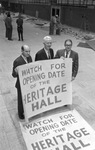 Lloyd J. Weaver, O. G. Carlson and Jenkins Garrett holding sign for opening of Heritage Hall