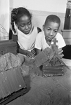 Image shows Judy Martin, daughter, 8, daughter of Mr. and Mrs. Rudolph Martin pf 3316 Ave. D., and Antonio Sanders, 10, son of Mr. and Mrs. O. D. Sanders of 932 E. Leuda, view a model pioneer church which is part of the display they constructed during the first week of the Bethlehem Center summer program. Published in Fort Worth Star-Telegram morning edition June 20, 1966.