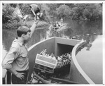 Six Flags Over Texas, Arlington, Steve Schellenberg doffs hat to group on debut ride "Run-a-Way Mine Train." There is the canoe ride in the back left with park guests.