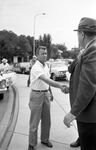 Jack Brand of Alvarado, Texas, father of slain Robert Brand, 17, met Earl Brown, Tarrant County chief deputy sheriff, to identify his son's body. Robert's body was found with that of Marcus Dunnam, 16, also of Alvarado, in the trunk of their car on August 7, 1966. A sheriff's car is seen behind Brand, a well as a car for WBAP News. Roy Green and Kenneth Allen McDuff were later charged with murder in the case.