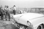 Bodies of Robert Hugh Brand, 17, and Marcus Dunnam, 16, were discovered in the trunk of their car on August 7, 1966. Officials are seen conferring while inspection of the car takes place. Roy Green and Kenneth Allen McDuff have been charged with murder in the case.