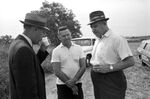 Bodies of Robert Hugh Brand, 17, and Marcus Dunnam, 16, were discovered in the trunk of their car on August 7, 1966. Officials are seen conferring while inspection of the car takes place. Roy Green, 18, and Kenneth Allen McDuff, 20, have been charged with murder in the case. Bill Sanders, center, discovered the bodies. Tarrant County Sheriff Lon Evans at right.