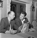 Dick Butler (left), executive vice president of the Spurs baseball club, talks with Hall of Famer Ted Williams, who opposes expansion to major league for five or six more years, 08/11/1966