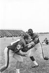 Arlington State College football players, quarterback Carl Williams (#6), left, with Raymond Matthews. The clipping reads "Rebel Hosses - Arlington State quarterback Carl Williams (back) hands off to halfback Raymond Matthews. Williams and Matthews are returning stars of last season's 6-3 Rebel team and starters again this season."