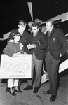 (Left to right) University of Arkansas football players Harry Jones and Jon Brittenum, and Coach Frank Broyles with fan Cheryl Brown, before their game with Texas Christian University (T. C. U.).